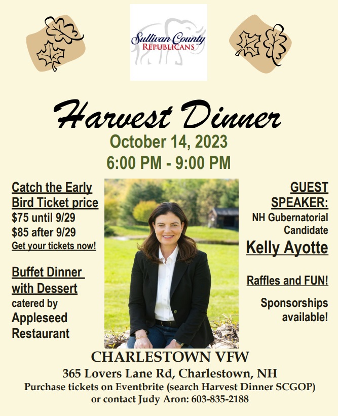 Come join Sullivan County Republicans and hear from NH gubernatorial candidate; Kelly Ayotte. This will be a fun night of fine food, GOP enthusiasm, and desirable raffle items! Delicious dinner buffet will be provided by Appleseed Catering.