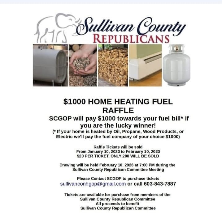 We still have raffle tickets to the Sullivan County GOP Heating Fuel Raffle. The drawing will be held on Friday, February 10 at 7:00pm at our campaign office, 24 Opera House Square, Claremont, NH.