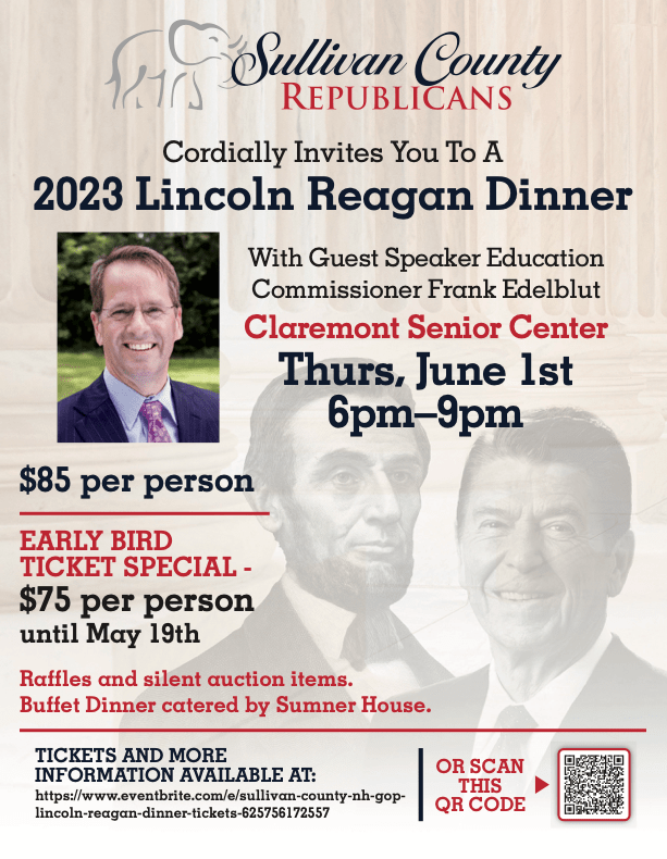 2023 Lincoln Reagan Dinner May 8, 2023July 4, 2024 WebAdmin Tickets on sale NOW. Get your tickets early and save!!! Tickets & InfoSubmitting form Discover more from The Sullivan County NH Republican Committee Subscribe to get the latest posts sent to your email. Type your emailโฆ Subscribe Share this: Click to print (Opens in new window) Print Click to email a link to a friend (Opens in new window) Email Click to share on Facebook (Opens in new window) Facebook Click to share on X (Opens in new window) X Like Loading... Related Published by WebAdmin View all posts by WebAdmin