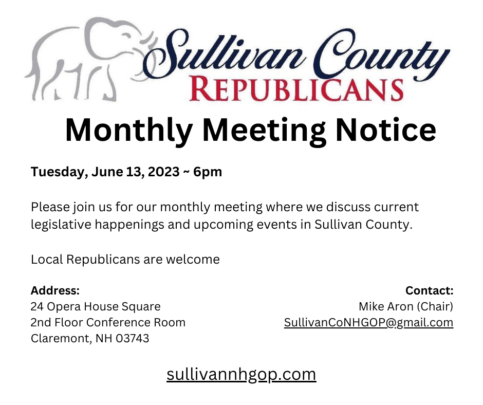 June 2023 Monthly Meeting Notice June 3, 2023July 4, 2024 WebAdmin Discover more from The Sullivan County NH Republican Committee Subscribe to get the latest posts sent to your email. Type your emailโฆ Subscribe Share this: Click to print (Opens in new window) Print Click to email a link to a friend (Opens in new window) Email Click to share on Facebook (Opens in new window) Facebook Click to share on X (Opens in new window) X Like Loading... Related Published by WebAdmin View all posts by WebAdmin