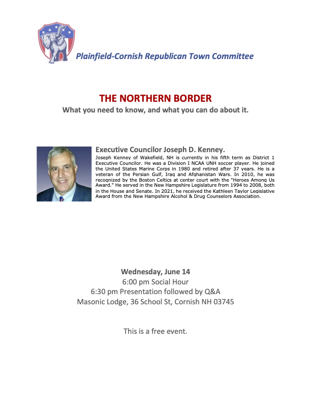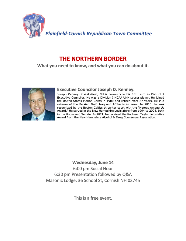 Plainfield-Cornish Republican Town Committee Event – June 14, 2023 June 3, 2023July 4, 2024 WebAdmin Discover more from The Sullivan County NH Republican Committee Subscribe to get the latest posts sent to your email. Type your emailโฆ Subscribe Share this: Click to print (Opens in new window) Print Click to email a link to a friend (Opens in new window) Email Click to share on Facebook (Opens in new window) Facebook Click to share on X (Opens in new window) X Like Loading... Related Published by WebAdmin View all posts by WebAdmin