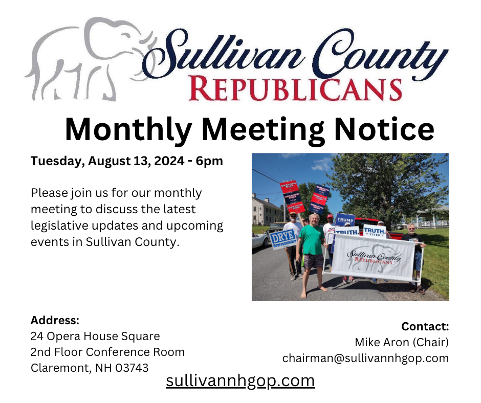 Mark Your Calendar: August 13th Meeting Announcement August 12, 2024 WebAdmin Please join us! Discover more from The Sullivan County NH Republican Committee Subscribe to get the latest posts sent to your email. Type your emailโฆ Subscribe Share this: Click to print (Opens in new window) Print Click to email a link to a friend (Opens in new window) Email Click to share on Facebook (Opens in new window) Facebook Click to share on X (Opens in new window) X Like Loading... Related Published by WebAdmin View all posts by WebAdmin