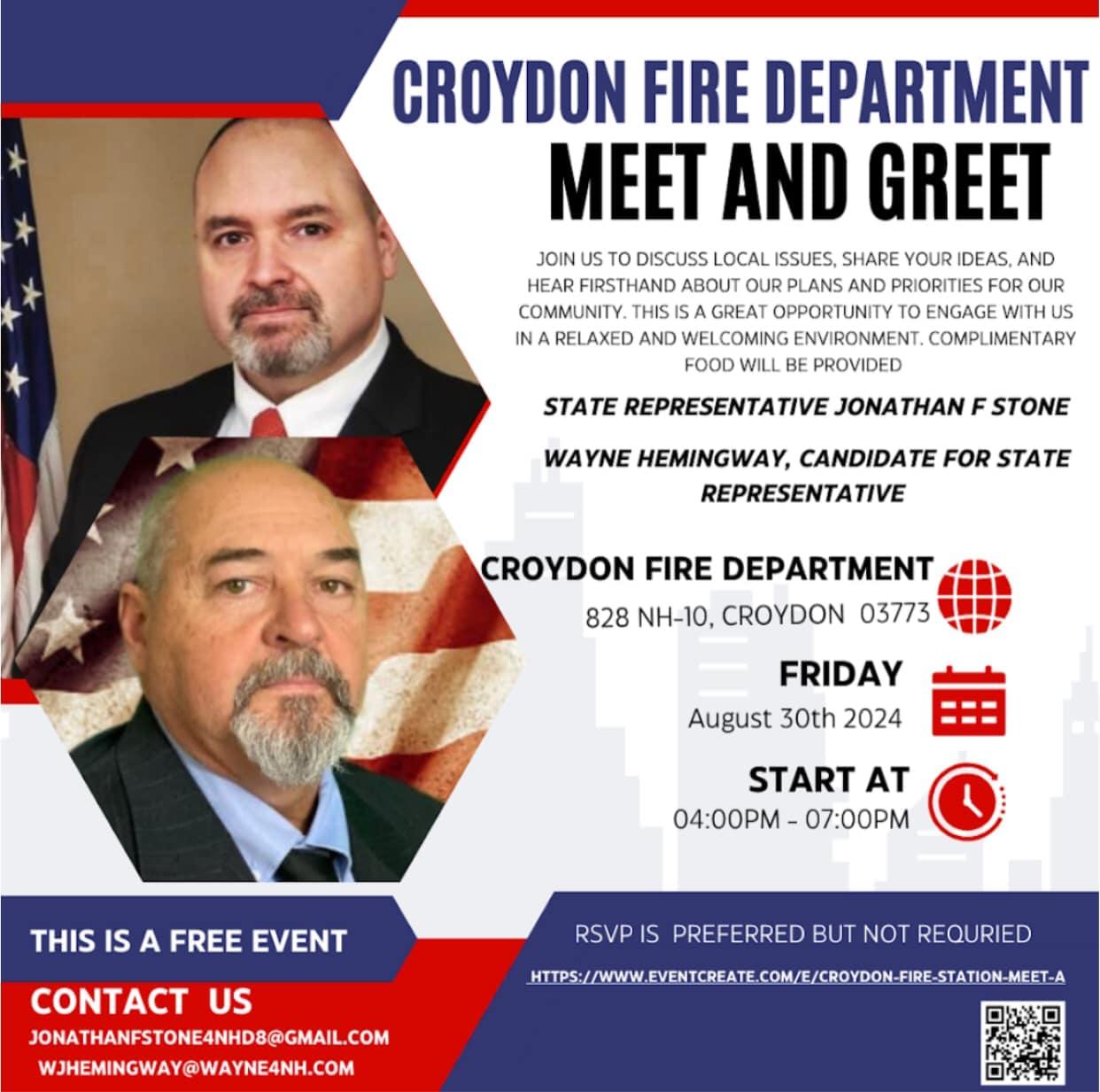 Croydon Fire Department Meet and Greet August 22, 2024 Kevin Tyson Discover more from The Sullivan County NH Republican Committee Subscribe to get the latest posts sent to your email. Type your emailโฆ Subscribe Share this: Click to print (Opens in new window) Print Click to email a link to a friend (Opens in new window) Email Click to share on Facebook (Opens in new window) Facebook Click to share on X (Opens in new window) X Like Loading... Related Published by Kevin Tyson View all posts by Kevin Tyson