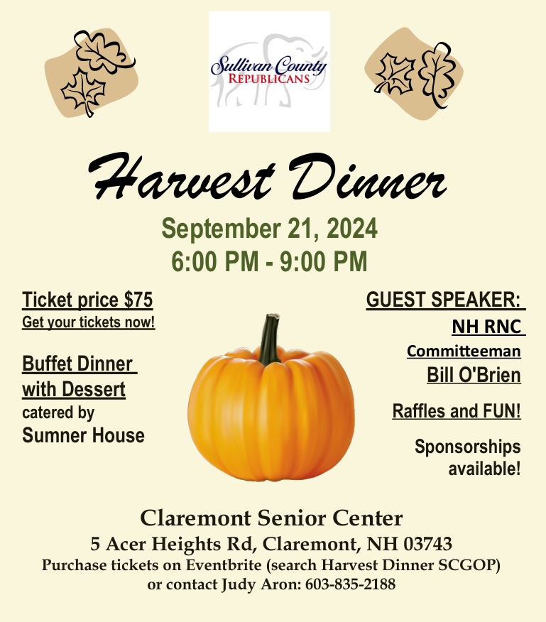 Sullivan County GOP Harvest Dinner: Reserve Your Seat Now September 2, 2024 WebAdmin buy ticketsSubmitting form Discover more from The Sullivan County NH Republican Committee Subscribe to get the latest posts sent to your email. Type your emailโฆ Subscribe Share this: Click to print (Opens in new window) Print Click to email a link to a friend (Opens in new window) Email Click to share on Facebook (Opens in new window) Facebook Click to share on X (Opens in new window) X Like Loading... Related Published by WebAdmin View all posts by WebAdmin